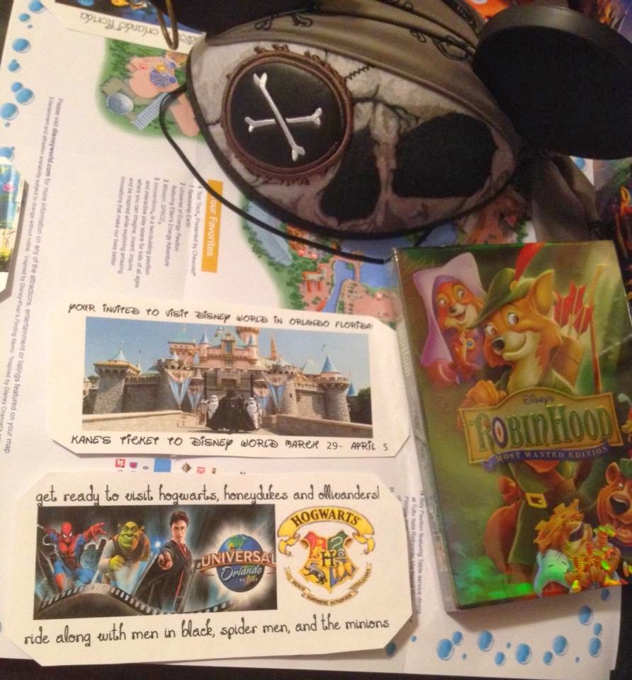 Cost $0.20cents I made and printed souvenir tickets to Disney and Universal for my kids on word processor and gave them to them for Christmas! I put pictures of the characters they each like on each ticket and wrote things like "The Disney princesses cant wait to meet Allie" It toke about 2 hours of my time ( I even download Disney fonts) I put it all in a Huge box that they opened Christmas morning.